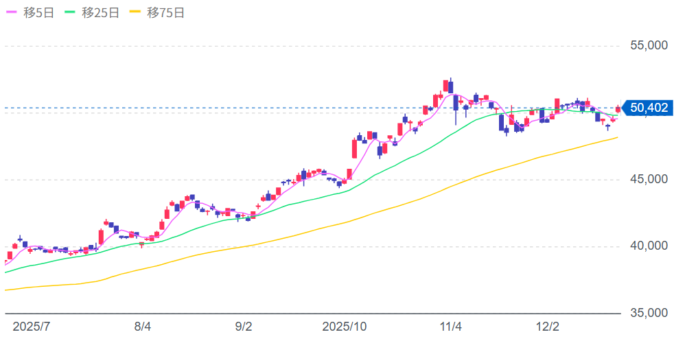 移動平均線の“向き”も重要で、線が右肩上がりになっていれば上昇トレンド、右肩下がりなら下降トレンドと、相場の勢いを判断できます。